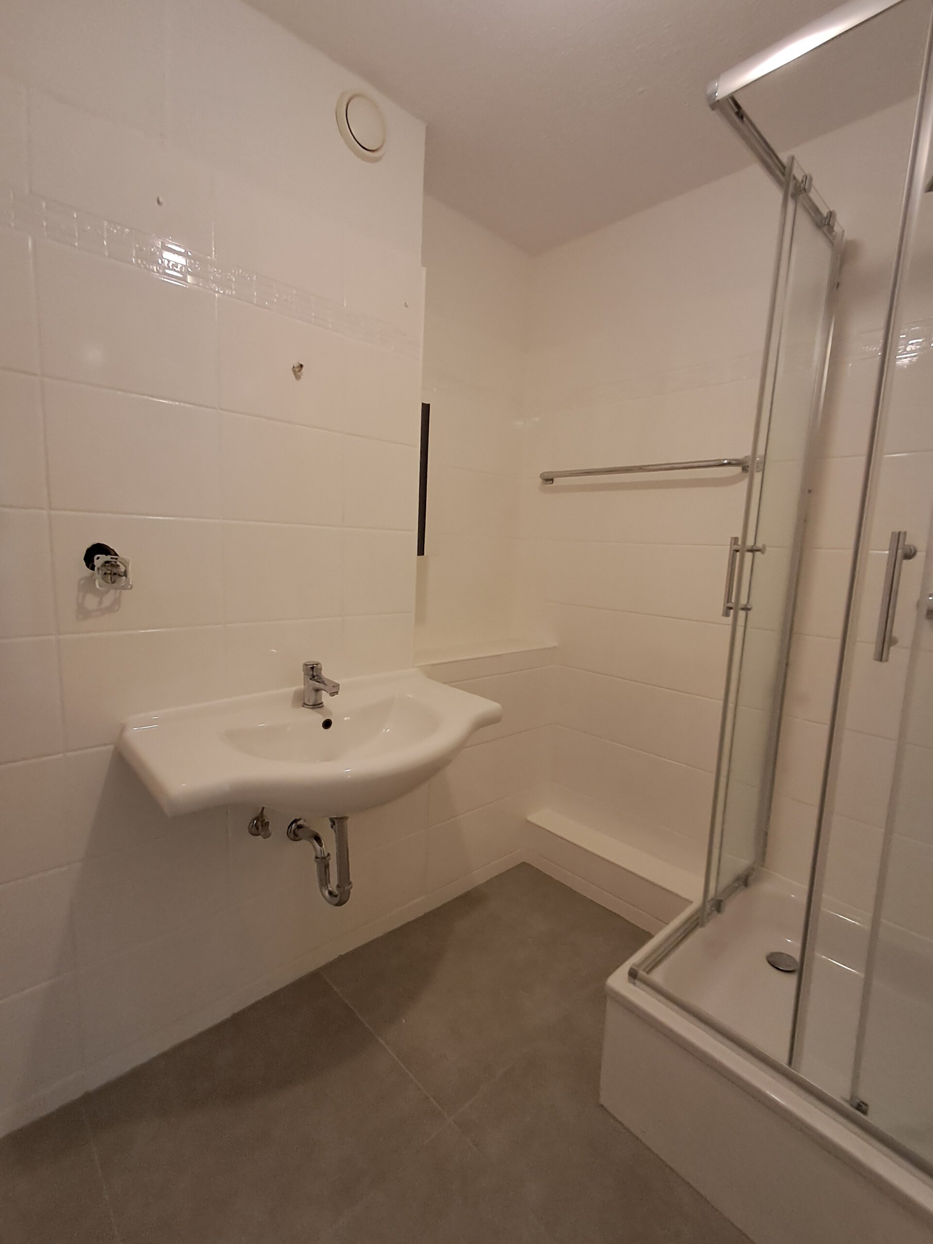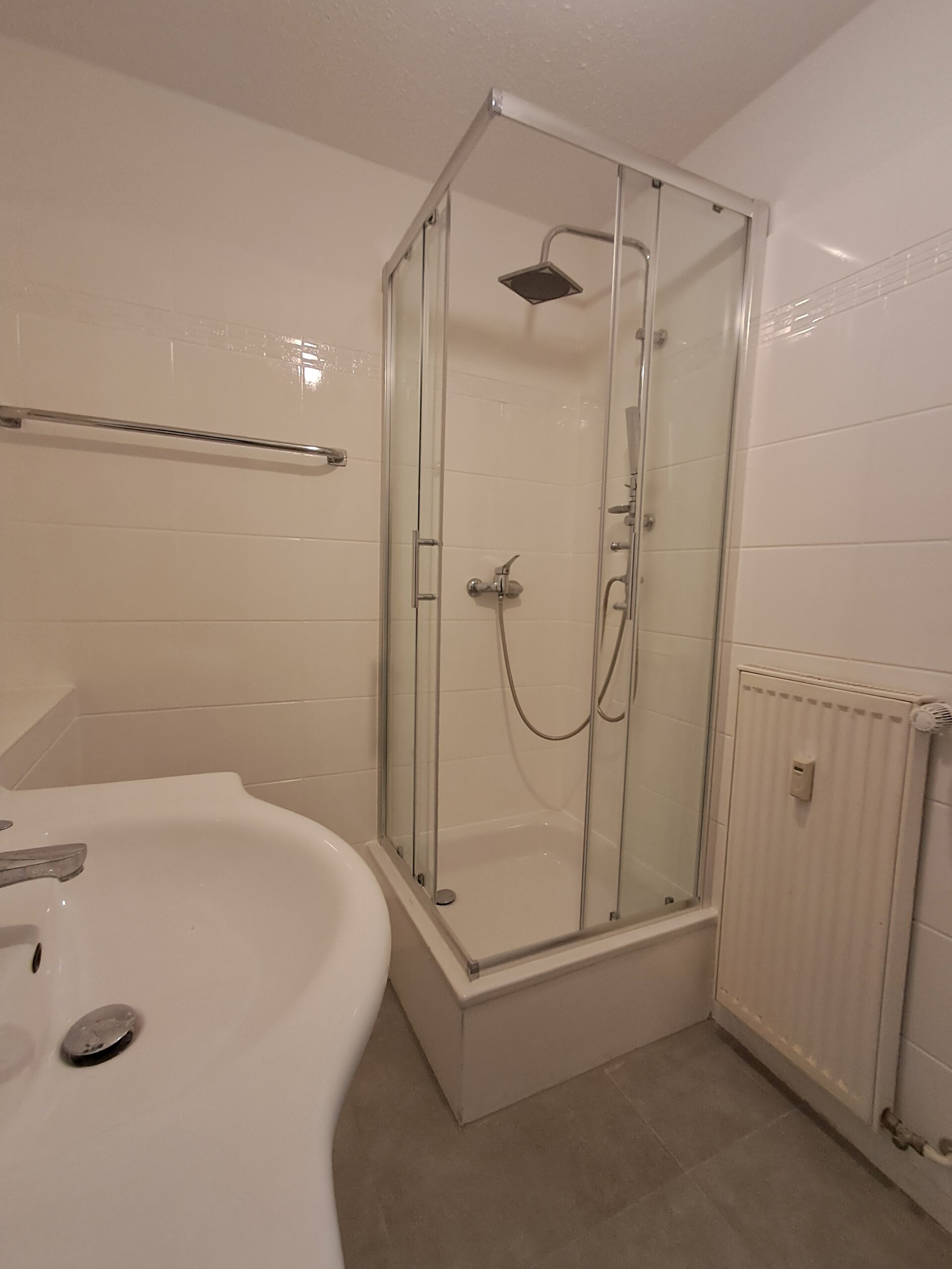 Ausgestattet ist das Bad mit einer Dusche, einem Waschbecken.
