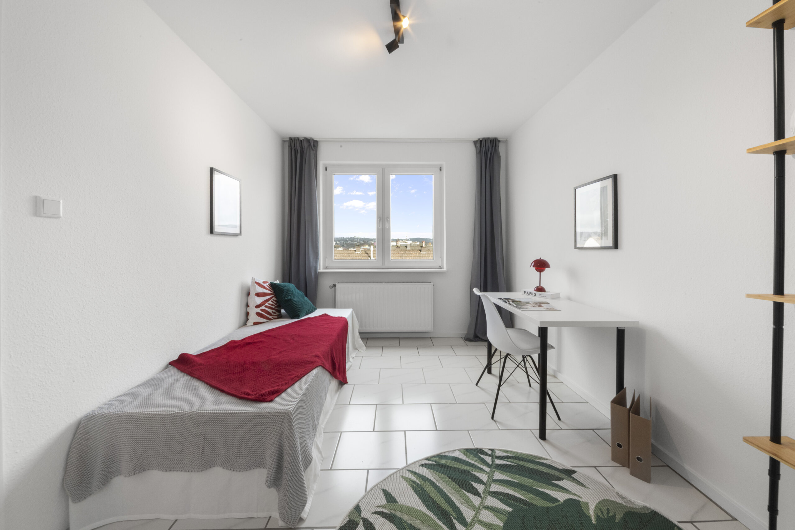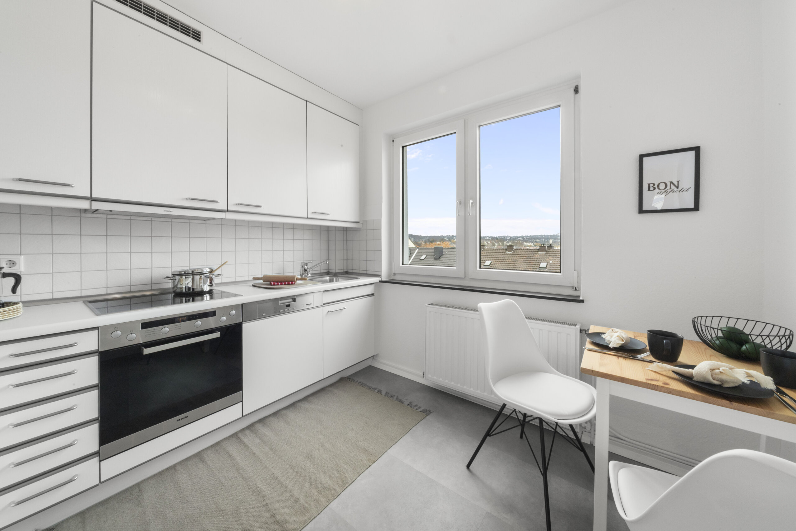 Die Wohnung hat frische, weiß gestrichene Wände und Decken, die Wände sind tapeziert.